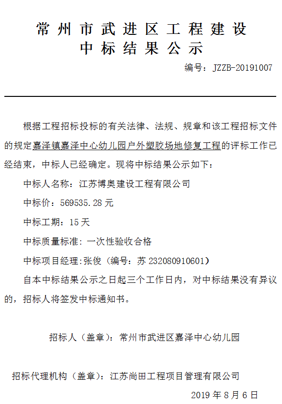 0519-81580101嘉澤鎮(zhèn)嘉澤中心幼兒園戶外塑膠場地修復(fù)工程中標(biāo)結(jié)果公示